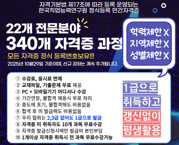 100만 회원이 선택한 믿을수 있는 교육원, 대한민국 교육브랜드 대상 수상 200과목 장학지원 이벤트!